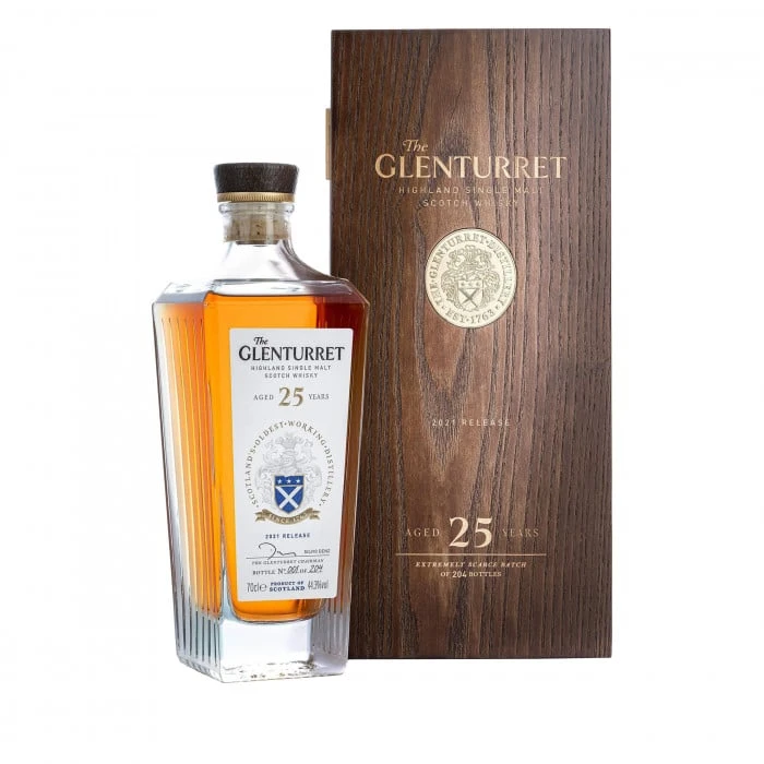 This rare and spectacular Glenturret 25-year-old single malt is one of only 204 bottles. After a long slumber for 25 years in a combination of American and European sherry oak casks, this expression has been bottled at 44.3% abv without chill filtration or added colouring.