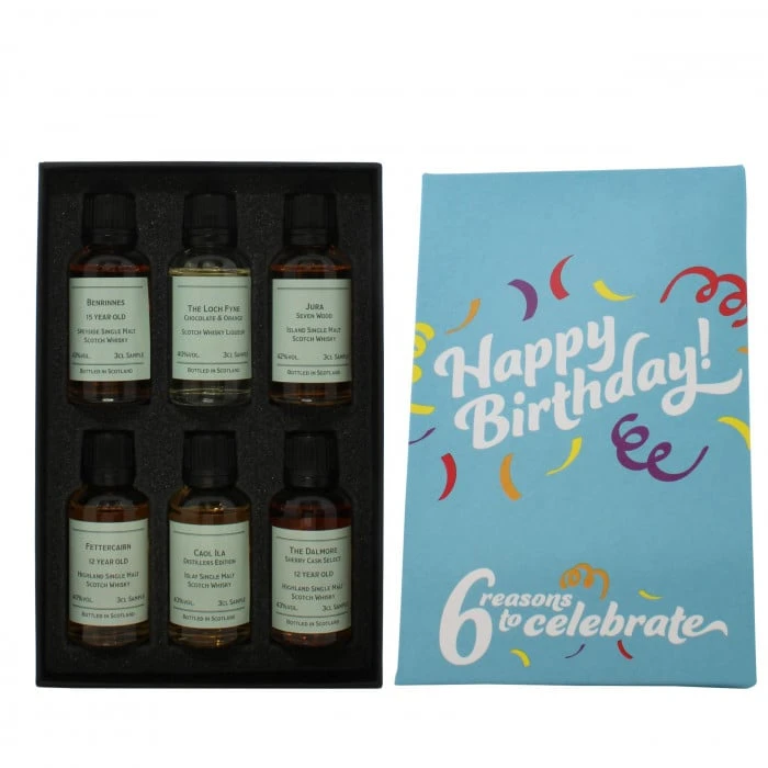 The dream birthday gift pack! Give your loved one six great reasons to celebrate this year. Included within this set is the Benrinnes 15 Year Old, The Loch Fyne Chocolate & Orange Liqueur, Jura Seven Wood, Fettercairn 12 Year Old, Caol Ila Distillers Edition, and The Dalmore Sherry Cask Select 12 Year Old.