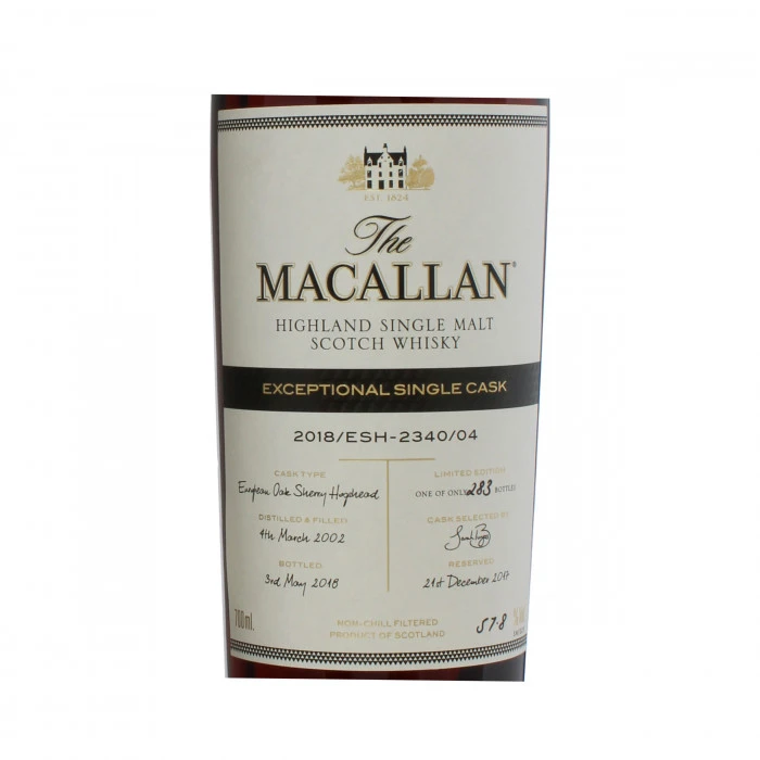 Distilled at The Macallan distillery as part of their Exceptional Cask range, this expression was distilled in early 2002 before spending more than a decade in a European oak sherry hogshead. It was bottled in spring 2018 with only 283 bottles produced and was originally available in Europe and direct from The Macallan.